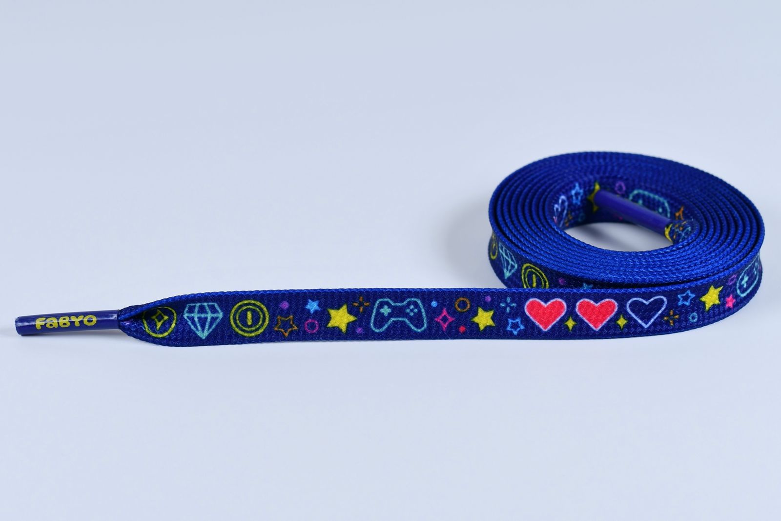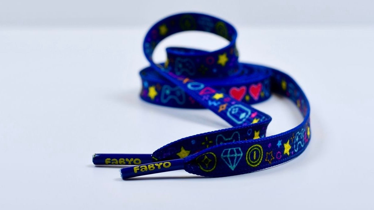The vibrant, arcade-inspired pattern features game controllers, stars, hearts and classic button icons in bold neon tones - like a retro console burst into life. Whether you're hitting the streets or the leaderboard, these laces bring a serious dose of character to your kicks.