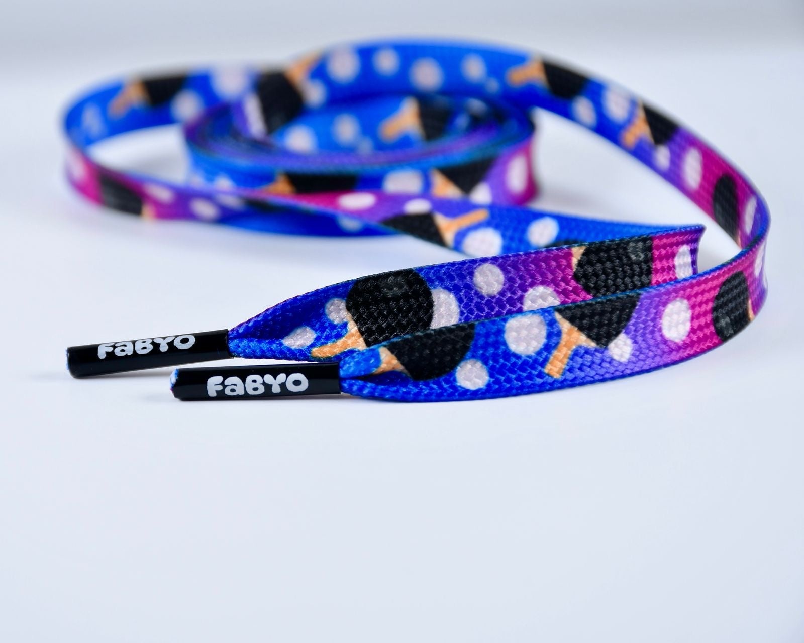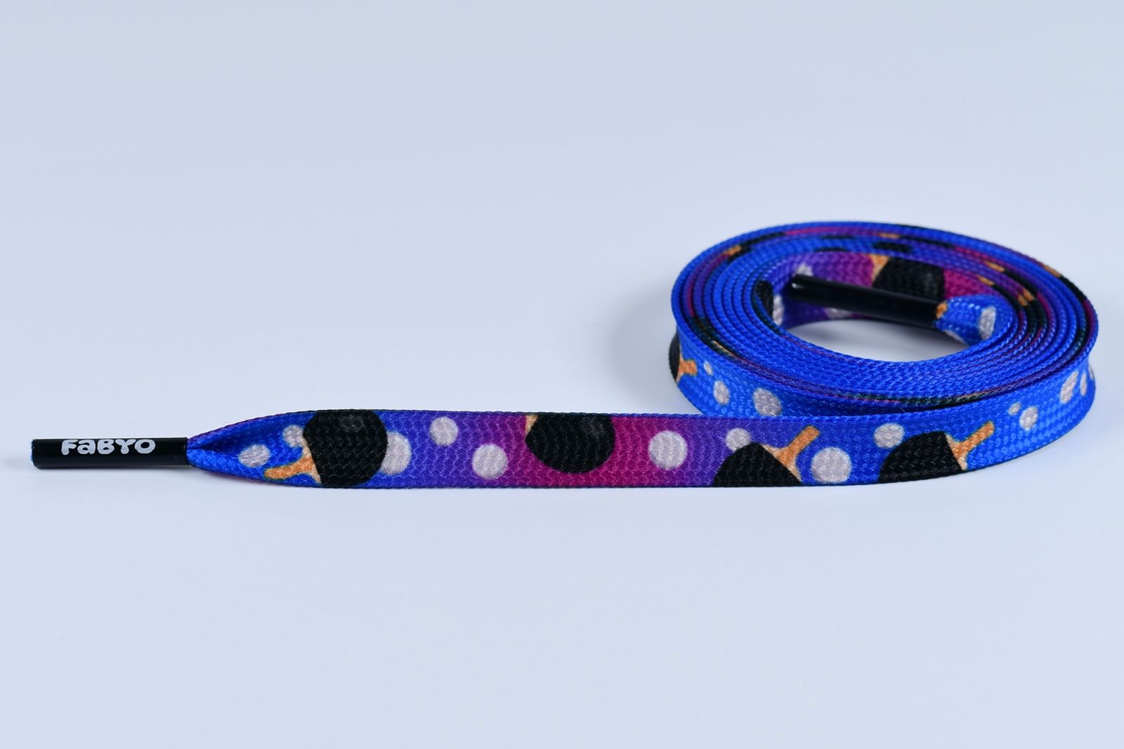 Fast hands, cool colours, and serious spin - Night Rally shoelaces serve up speed with a side of edge. Set against a sleek gradient from electric blue to deep purple, the scattered pattern of black table tennis bats and balls gives these laces a crisp, confident look that plays well on and off the court.