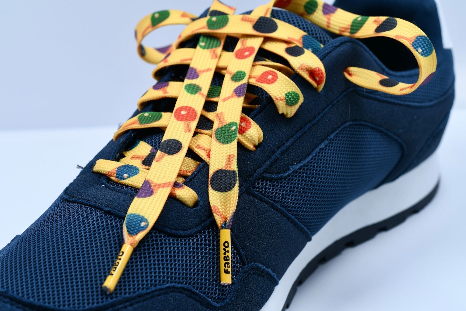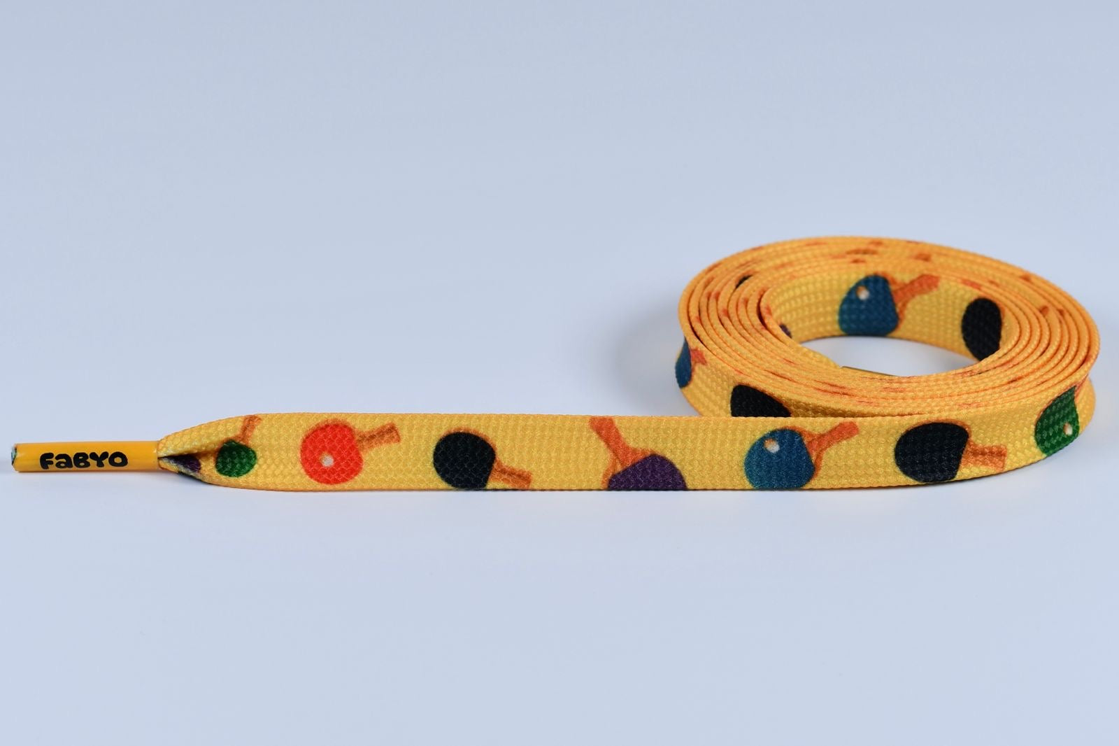 Serve up a splash of colour with the Yellow Bat Bounce shoelaces - a bold, cheerful design featuring multicoloured table tennis bats set against a sunny yellow background. Bright, fun, and full of energy, they’re a playful nod to the sport with a light-hearted twist.